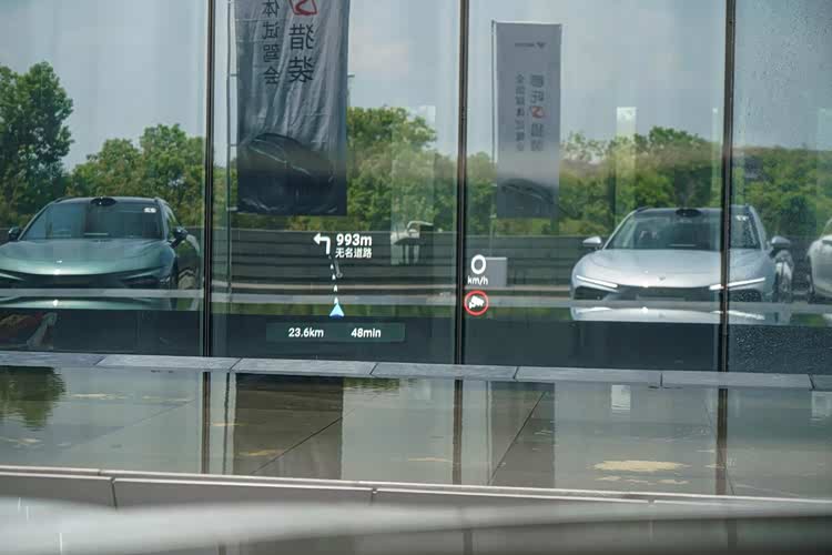 AR-HUD的显示范围确实够大也够清晰,AR模式下可以在道路上显示虚拟的箭头动画,也可以使用普通模式直接将导航地图显示在上面。