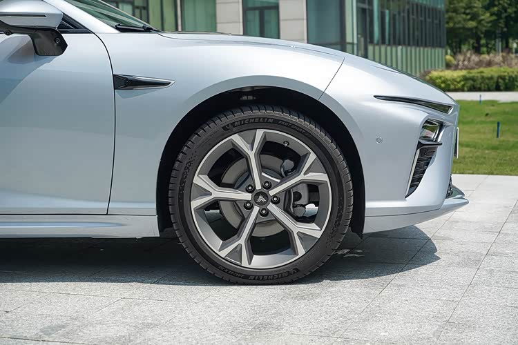 我们这次拿到的试驾车是增程版的300MAX高配车型,搭载了20英寸的轮毂+245/45的米其林PS EV轮胎,搭配的是普通的对向前四活塞刹车卡钳,另外纯电的猎装640 AWD版还会搭载红色的运动卡钳。