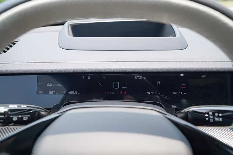 我们试驾的增程版本使用1.5L四缸增程器,WLTC工况下的馈电油耗为5.7L/100km,配合43.88度的三元锂电池,其纯电续航为300km,整车的满油满电综合续航可以达到1200km。