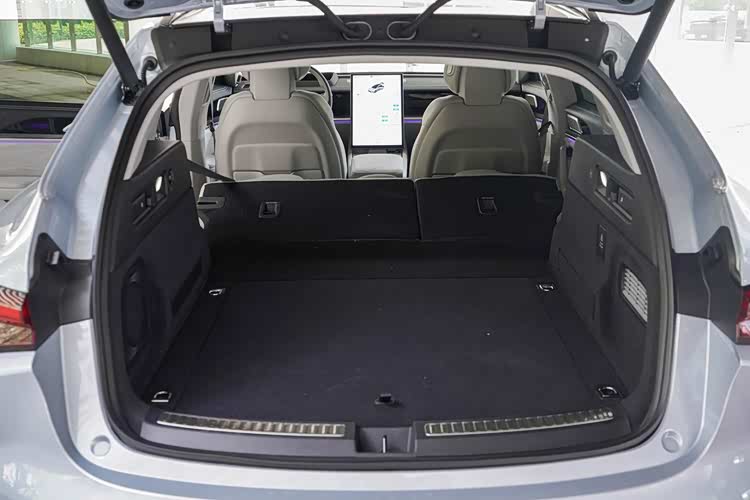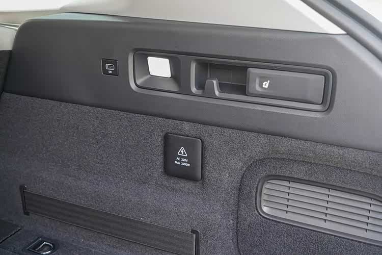 座椅可以使用后备厢内的把手进行放倒,并且还带有USB借口和220V的标准插座,最大输出功率为2.2kW,去野外露营带动单个电子炉之类的刚好够用。另外整个后备厢盖板下层还有额外的储物空间可以拓展。