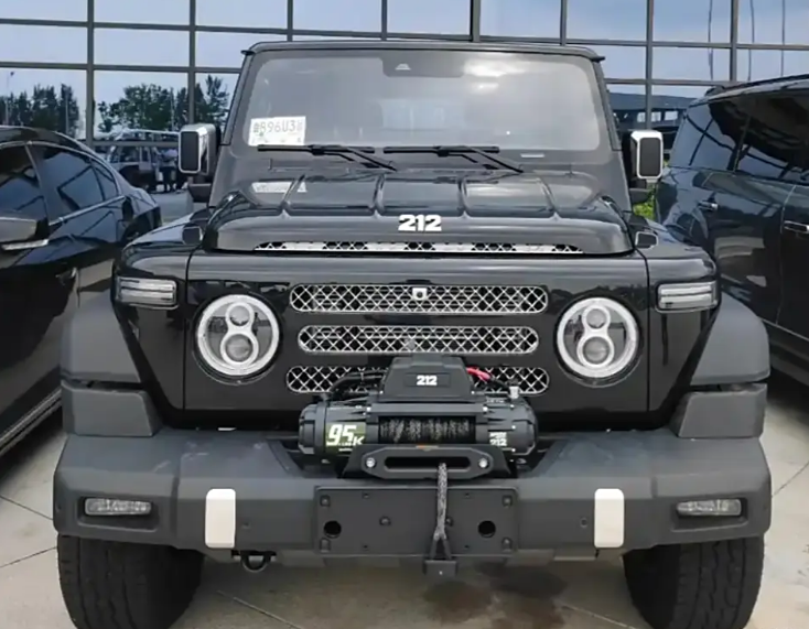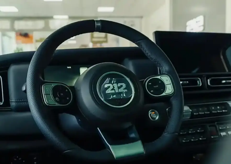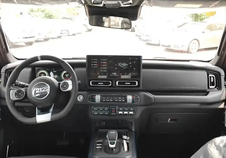外观上,全新 212 延续“方盒子”经典造型,非承载式车身,黑色涂装如奔驰 G 级,稳重大气。车头三个横向中网与圆形灯组结合,时尚且具辨识度,车尾线条流畅,蚌式发动机舱盖使造型统一。