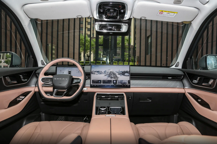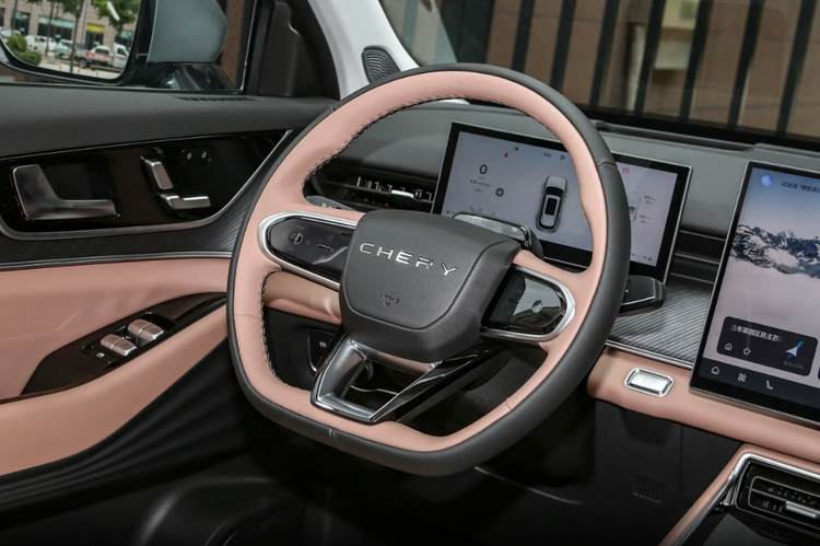 内饰方面,可以看出瑞虎8L的车内采用了极简的设计理念,15.6英寸的窄边2.5K高清中控大屏,视觉上给到的科技感和档次感提升了不少,而四辐式平底方向盘拥有不错的握持感并且还采用了真皮材质进行包裹。当然在用料方面也十分厚道,不仅采用了大面积的软性材质包裹,细节上还加入了银色金属饰件和钢琴烤漆进行点缀,从而提升了车内的精致感。