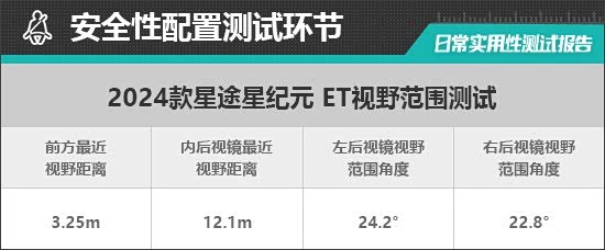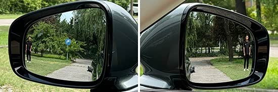 测试车辆的左/右外后视镜均采用普通镜片。实测左外后视镜视野范围为24.2°,右外后视镜视野范围为22.8°。左侧外后视镜视野范围处于同级别中下游水平,右侧外后视镜视野范围处于同级别上游水平。