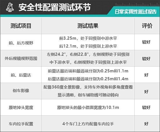 在车辆前、后方视野测试中,车内所有座椅均已调整至最低状态,所测出的数据与驾驶者正常使用时均有一些偏差,仅供参考。