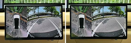 评测车配备了360度全景影像,并提供透明底盘功能,方便驾驶员查看车辆底部道路情况。影像清晰度不错,车辆周围的畸变控制也比较合理,还配备了泊车辅助线,实用性不错。