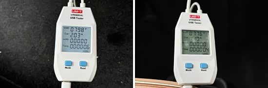 此外,我们对USB接口的电压与电流进行了测试。其中,前排USB Type-C接口的电压和电流分别为7.98V和2.03A左右,后排USB Type-C接口的电压和电流分别为7.76V和1.1A左右。