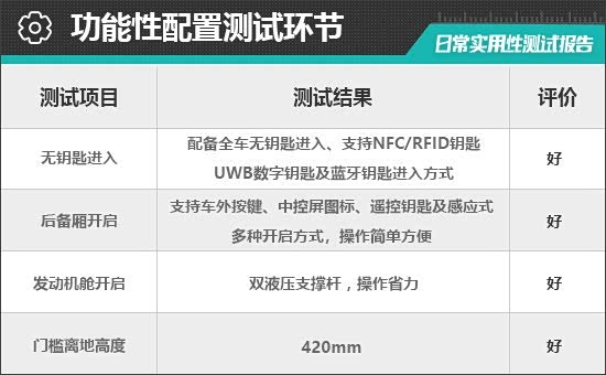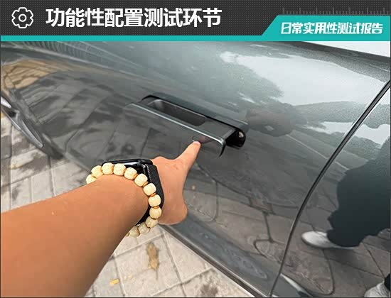 在功能性配置方面,评测车配备了全车无钥匙进入功能,携带遥控钥匙或蓝牙钥匙走到车旁车辆便可自动解锁,十分便捷。此外,评测车还配备NFC/RFID钥匙,只需贴在B柱的感应区即可解锁车辆,实测解锁和上锁过程均十分顺畅。