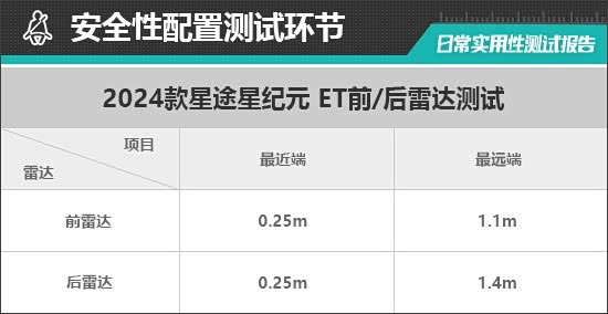 评测车前雷达最远可以在1.1m处感应到前方物体,雷达功率表现较好;持续蜂鸣提示距离为0.25m,同样与测试经验值保持一致。