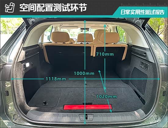 对于评测车后备厢的基础数值,我们也进行了实测,开口长度为1000mm;开口宽度为1118mm;后备厢进深为1020mm;后备厢地台与顶部的垂直高度为710mm。