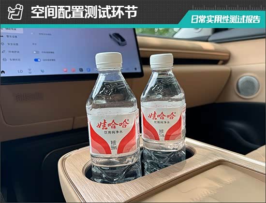 对于车内使用空间的测试,只针对前排触手可及的空间,不包括手套箱、中央扶手箱等需开启的空间。测试方法是将以下固定物品全部放置在前排的各个储物空间内,通过固定物品的放置情况来判断车辆储物空间的表现。测试选定的固定物品为:2瓶常规大小的矿泉水、1部大屏手机、1支口红、1个挎包、1副墨镜、1把折叠雨伞以及1包常规尺寸的抽纸。