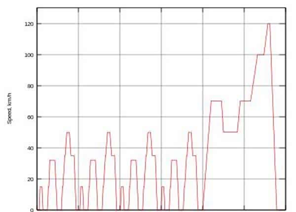 市区测试先是怠速11秒。接着用4秒加速到15km/h,匀速行驶8秒之后刹车停止21秒,再加速到32km/h匀速行驶24秒、停止21秒,在加速到50公里km/h匀速行驶26秒,减速到35km/h行驶8秒让后停车,单词测试需要195秒,理论行驶距离为994.03米,一共重复4次。测试出的结果,就是新车上贴的汽车燃料消耗标识里市区工况的油耗了。