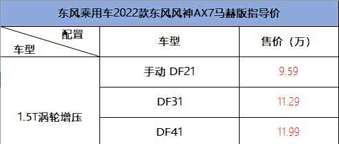 东风风神AX7马赫版共有4款车型,其中DF21为全系唯一一款手动挡车型,指导价9.59万。另外3款则为自动挡车型,指导价区间为11.29-12.99万。