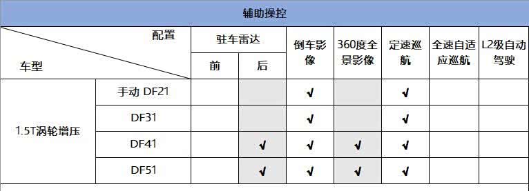 最后再来看看辅助操控配置,全系标配的有倒车影像和定速巡航功能。DF41和DF51在此之上还多出了后驻车雷达,以及360度全景影像这两项配置。