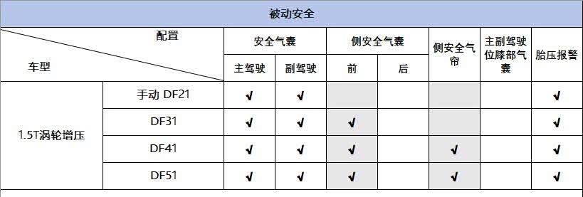 东风风神AX7马赫版的4款车型在被动安全配置上,标配了主副驾驶座2个安全气囊,DF31在此之上多出了2个前排侧安全气囊,车内一共给到4个。DF41和DF51则还要多出2个侧安全气帘,车内一共给到6个安全气囊。最后是主动安全配置上,全系标配的只有一些基础的ESP、EBA等初级安全配置,只有DF41和DF51给到了进阶的并线辅助功能。