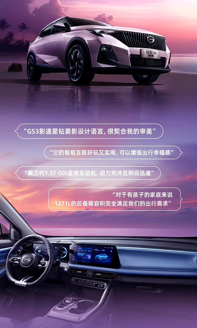 内饰方面,“一份紫”带来了360°全景高清影像+透明底盘、10项L2级智驾辅助系统。但是在中控屏幕配置上没什么升级,依旧是7英寸彩色液晶仪表盘连体12.3英寸中控屏。而传祺 GS3“影速劲智 MAX 版”将这个短板给补上了,12.3 英寸中控屏、前排座椅加热、主驾电动调节、手机无线充电等等,也给安排上了。