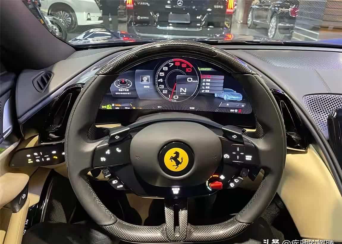 内饰方面,采用与Stradale款式相同的三辐式多功能方向盘,液晶仪表盘采用16英寸曲面屏幕。中控屏幕为纵向放置,副驾驶前方的副屏可了解更多行车信息。Roma 的驾驶舱采用近乎对称的结构,使空间和功能的分布更加有机,让乘客不仅感到舒适,而且感觉参与了驾驶。法拉利造型中心为 Roma 外观设计的方法以简洁的设计和各种元素之间的绝对共生为中心,具有和谐的比例和纯净、优雅的体积。为了强调极简主义,所有多余的细节都被删除 了。