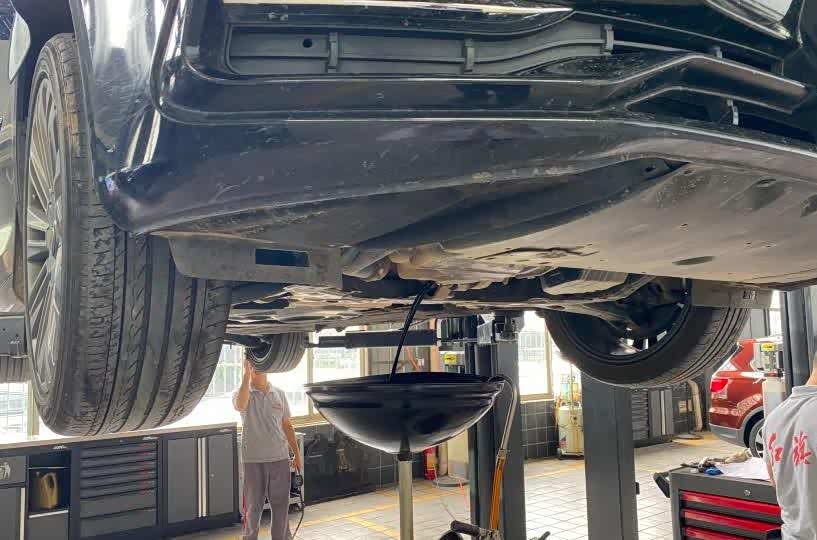 将车辆抬起,卸掉底部护板后就能见到存放机油的缸体,拆掉放油螺丝依靠重力便可将已使用过机油放出,这块需要注意的是避免螺丝上沾到灰尘,影响内部。