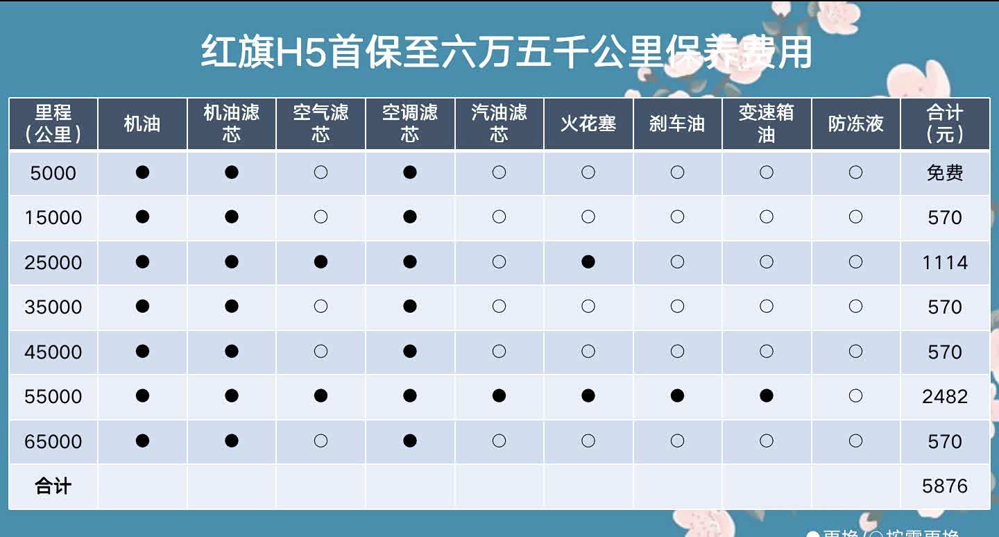 按照老规矩,我们先对红旗H5各阶段的保养项目以及费用进行总结。当新车行驶里程达到5000公里或者购车时间满6个月的时候进入首保期(先到者为准),而后续的保养周期为10000公里/次,与那些5000公里一保的车型相比,红旗H5相对来说要省心省力不少。需要注意的是,红旗H5的空调滤芯是每10000公里更换,也就是说日常小保养不仅要更换机油、机滤,还需要换空调滤芯。空气滤芯和火花塞都是30000公里更换一次,变速箱油和刹车油则是每60000公里更换一次,总体来看,红旗H5易损配件的耐用性还是不错。通过计算得知,红旗H5首保至六万五千公里保养费用共计5876元,处在同级别车型的主流水平。