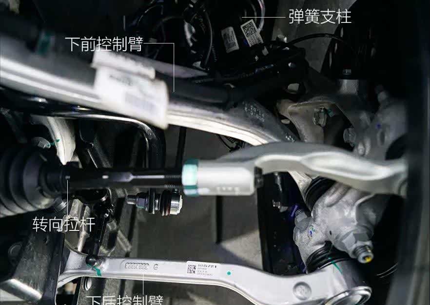 凯迪拉克CT5的前悬架采用了优化后的麦弗逊式独立悬架,也被称之为双球节麦弗逊式悬架,这与宝马的双球节弹簧减振支柱前桥在结构上非常相似。由两根连杆代替L形摆臂,这样设计的好处是主销的下止点能够被后控制臂拉伸,允许径向移动,从而让轮胎在转向时更加贴合地面,保证抓地力,一定程度上提高了车辆的操控性。