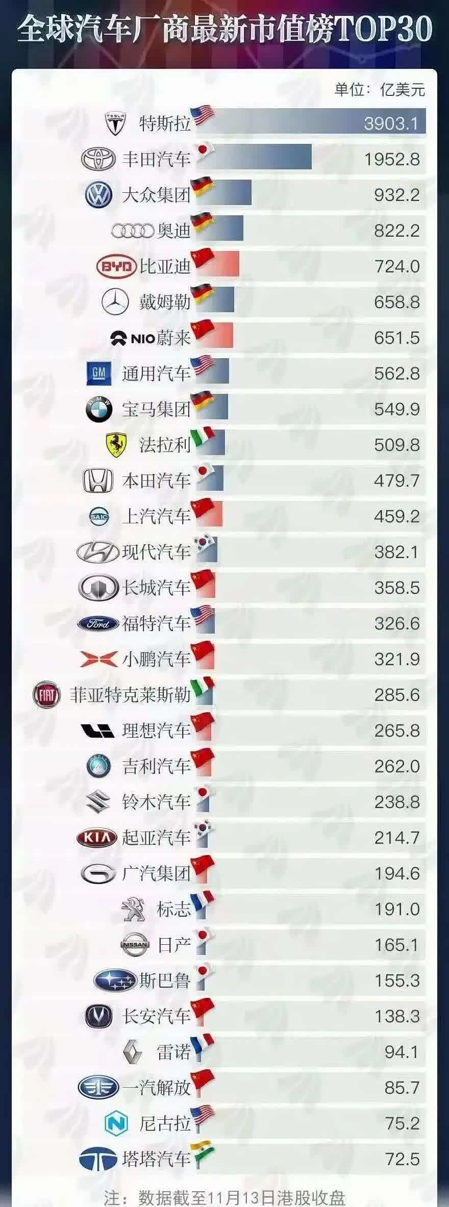 据统计显示,在全球市值排名前30的知名汽车厂商中,中国企业有10家,有2家企业冲进前10。截至11月13日,比亚迪市值约724亿美元,超越戴姆勒的659亿;蔚来市值652亿美元,超越通用和宝马;长城汽车市值359亿美元超越福特;小鹏汽车市值超300亿美元,理想、吉利等车企市值也均超200亿美元。
