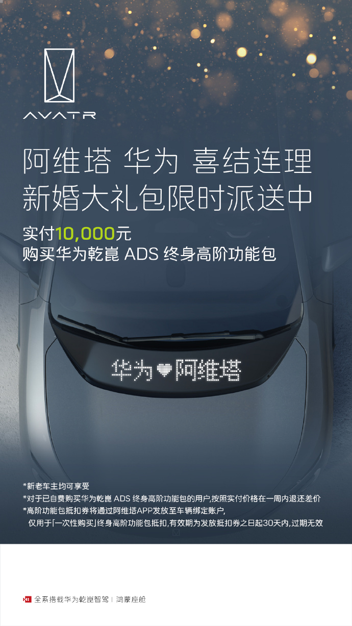 “在限定时间内,华为乾崑ADS终身高阶功能包实付价格将调整至10,000元。已提车用户于2024年8月23日(含)至9月21日(含)期间,一次性购买华为乾崑ADS终身高阶功能包(即日起至2024年12月31日,阿维塔车主“一次性购买”价格将调整至30,000元),可享20,000元抵扣;已下定未提车及2024年8月23日(含)至9月30日(含)期间下定用户,提车后可享20,000元高阶功能包抵扣券(该抵扣券将通过阿维塔APP发放至车辆绑定账户,仅用于“一次性购买”高阶功能包抵扣,有效期为发放抵扣券之日起30天内,过期无效)。”