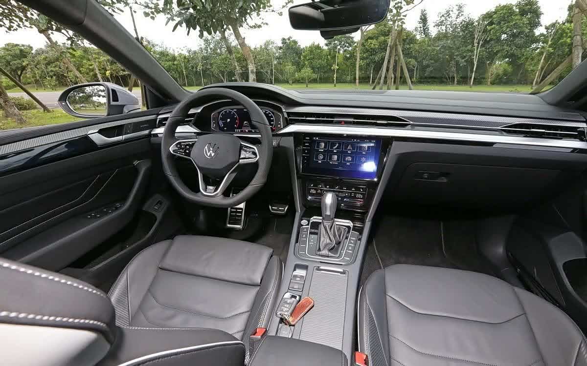 打开车门,由中控台一路延伸至两侧车门饰板上缘的立体饰板设计同样引人注目,多段转折配合镶嵌其中的雾面镀铬饰条、黑色钢琴烤漆饰板,亦再次彰显无愧于家族旗舰身份的细腻作工,至于三幅式运动化多功能方向盘与Nappa Carbon碳纤维纹真皮跑车座椅等R-Line专属配置,不仅可增添跑格气息、也能进一步提升座舱豪华质感;