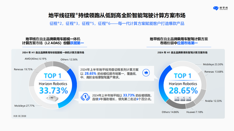 根据高工汽车研究院最新数据,地平线在2024年上半年中国市场自主品牌乘用车前视一体机和智驾计算方案市场市占率同时位居第一,持续领跑从低到高全阶智能驾驶计算方案市场。同时,近期地平线宣布征程家族产品累计出货量再创新高,已突破600万套。