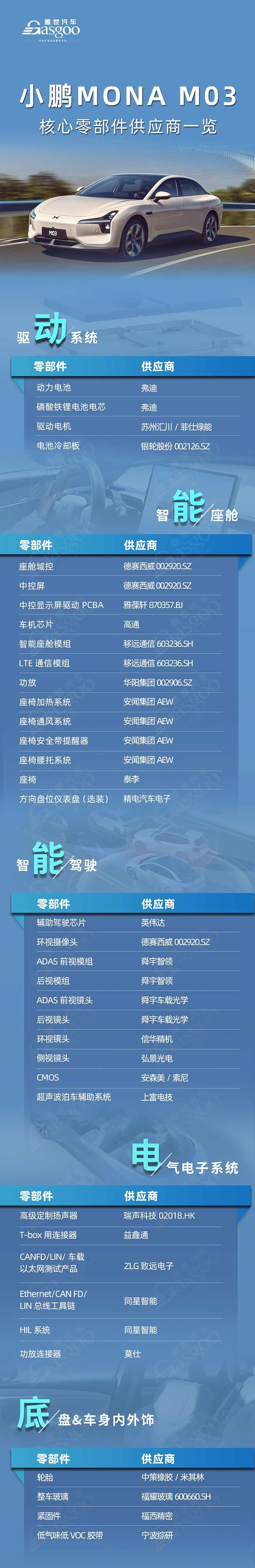 接下来,M03即将开启全国大规模交付。为更好了解这款新车,盖世汽车收集整理了小鹏MONA M03的核心零部件供应商信息,欢迎更多行业朋友进行信息补充和更正。
