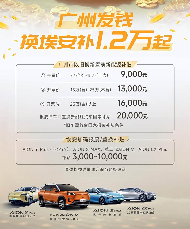 而广汽埃安在广州市补贴的基础上,还为消费者额外提供了3000元-10000元的置换补贴,老广换埃安可补1.2万元起。