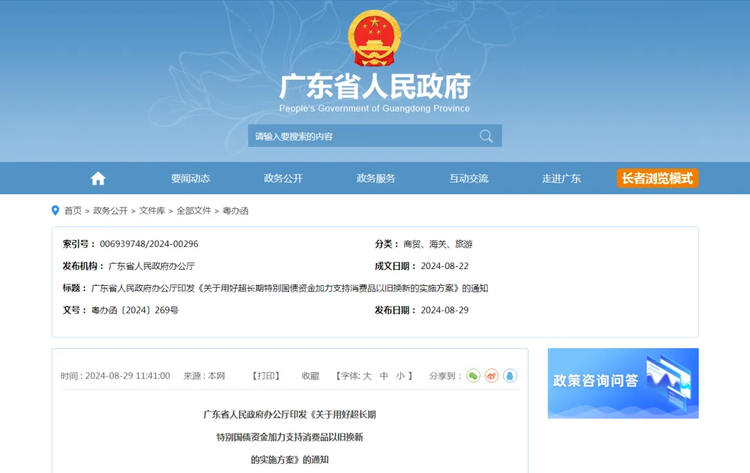 8月30日,广州市政府印发了《广州市用好超长期特别国债资金加力支持消费品以旧换新实施方案》的通知。