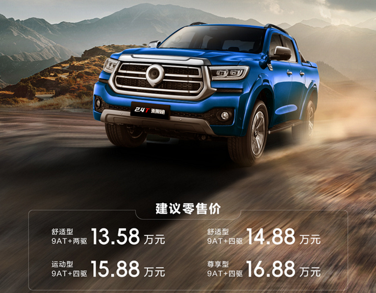 8月中旬,长城炮乘用休闲品类创新力作2.4T乘用炮柴油全系车型正式上市,新车分为两驱/四驱、舒适型/运动型/尊享型共4款车型,搭载2.4T柴油+9AT动力组合,售价为13.58-16.88万元。