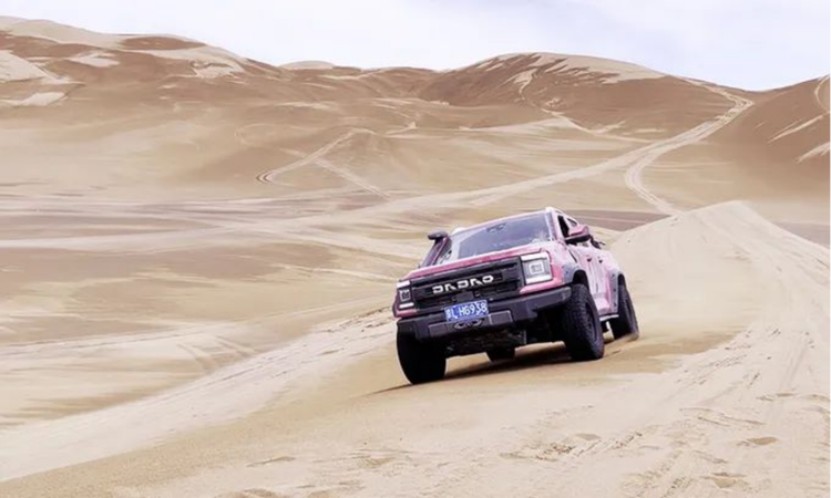大道山地版进行了很多优化设计。它的前脸外观做了全新升级。为了适应各种越野环境,我们增加了越野前格栅、265AT轮胎,前后铁质保险杠和底盘防护板等等,满足各种复杂路况,确保底盘抗造。针对特殊工况也做了特殊动力调校。我们发现皮卡在爬坡时,在高载货长坡段上坡过程中,基本上市面上的产品都很难满足客户需求,爬坡爬不上去,拉货特别吃力,我们做到了低速高扭高爆发。同时在这种高强度的拉货过程中,新车持续性做得特别好。