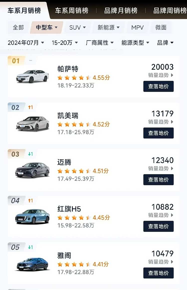 然而,细究之下可以发现,在15~20万元的细分市场中,仍然还是以帕萨特、凯美瑞、迈腾、雅阁等合资燃油车为主力阵营,占据了绝大部分市场份额,这就说明了绝大部分消费者在选购B级车时,首先考虑的还是合资品牌。而帕萨特Pro、第九代凯美瑞、迈腾B9等主流畅销车型纷纷上马,也证实了合资品牌想要在自主新能源的不断冲击之下,能稳住当下稍占优势的局面。