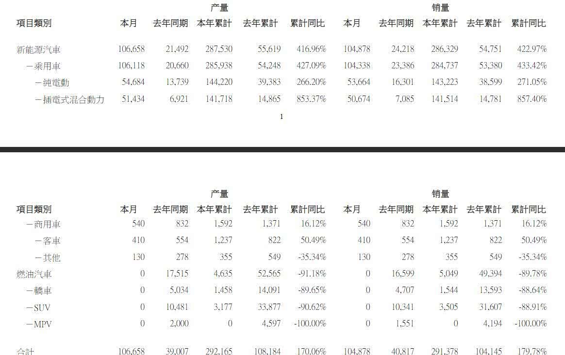 比亚迪3月产销快报同时显示,今年3月,3月新能源汽车产量为106658辆,销量为104878辆,而3月份燃油汽车的产量和销量均为0。这意味着今年3月,比亚迪的产销已全面实现电动化。