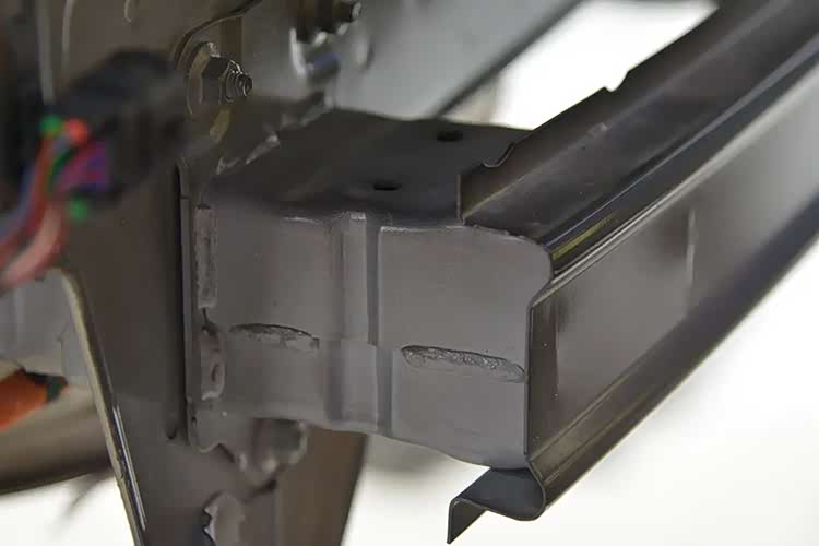 C16的前吸能盒也采用铝合金材质,带有溃缩打孔,没有褶皱。