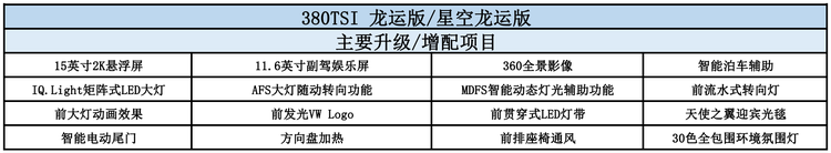 中配的龙运版/星空龙运版相比入门车型升级了15英寸2K悬浮屏和11.6英寸副驾娱乐屏,车内科技氛围进一步增强,同时在灯光系统方面也升级了功能丰富的IQ.Light矩阵式LED大灯、前发光VW Logo以及前贯穿式LED灯带,舒适性配置方面则新增了方向盘加热、前排座椅通风、智能电动尾门等,对应2万元的价差,物有所值。