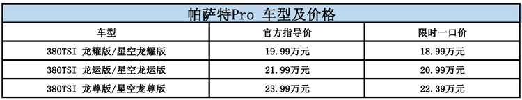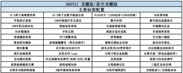 至于具体的车型推荐,我们认为顶配的380TSI 龙尊版/星空龙尊版值得重点考虑,更强的智能辅助驾驶、更舒适的驾乘体验,更重要的是按“限时一口价”,顶配车型仅比中配高1.4万元。当然,如果您预算有限,入门的380TSI 龙耀版/星空龙耀版同样值得考虑,以“限时一口价”18.99万元的标准,该有的主流配置和智能驾驶辅助系统应该说一个都没落下。