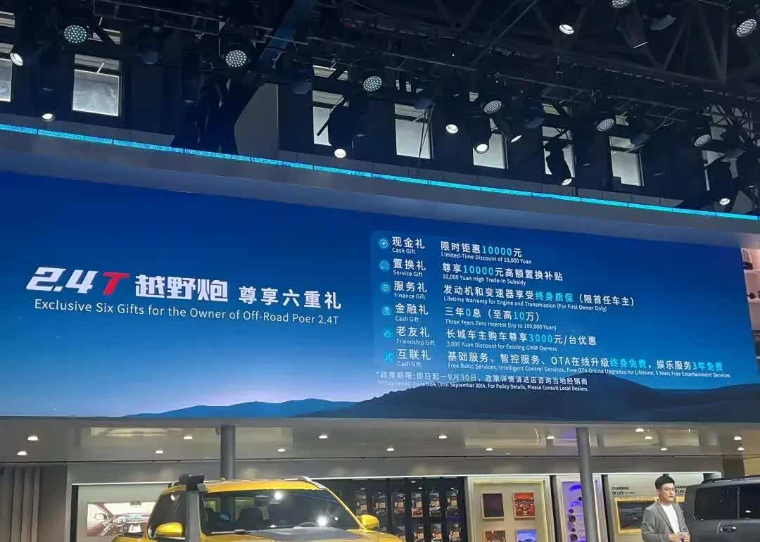 即日起至9月30日,下订2.4T越野炮可以享受10000元的现金优惠,以及10000元的置换补贴,首任车主发动机和变速器终身质保、3年0息(至高10万)、长城车主尊享3000元/台优惠,以及基础服务、智控服务、OTA在线升级终身免费等多项优惠服务。