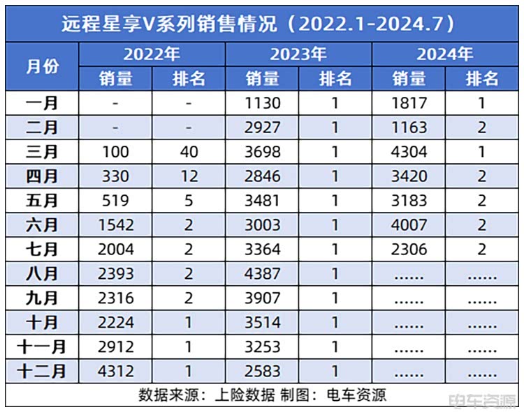2022年3月7日,远程星享V系列正式上市,据电车资源数据显示,2022年3月和4月,远程星享V并未挤入TOP榜单,但在2022年5月单月位列新能源物流车榜单第五,并从2022年10月连续16个月霸榜新能源物流车销量榜单。