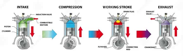 如今常见的活塞发动机大多为四冲程设计,四个冲程是指发动机曲轴每旋转两周,经历进气、压缩、做功、排气,总共四个冲程,完成一次循环,简单来说就是四个步骤,在四个冲程中,只有一个冲程用来做功,推动活塞上下运动,再通过连杆带动曲轴,将汽油燃烧产生的能量利用,曲轴旋转,通过变速箱和半轴传递到轮胎,带动车轮旋转,这是发动机的基本原理。
