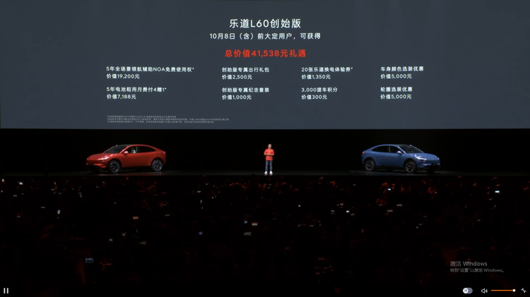 今晚,乐道L60正式上市。售价区间为14.99-23.59万!乐道L60定位为纯电动中型SUV,其中整车购买的价格为20.69万-23.59万,电池租用的价格为14.99万。同时,该车支持电池租用方案,60千瓦时电池月租费用为599元,85千瓦时电池月租费用为899元。10月8日前下大定的用户均为创始版车主,可获得价值41538元的相关权益。据悉,乐道L60将于9月28日开启交付。