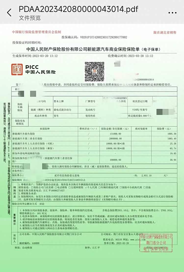我说我自己吧,开的是国产插电混动车,第一年的商业险是2931元,交强险是950元,没有车船税,还买了一个“如意行”驾乘险,260元,是保驾驶员和乘客的,第一年保险总计费用是:4141元,买的是人保。