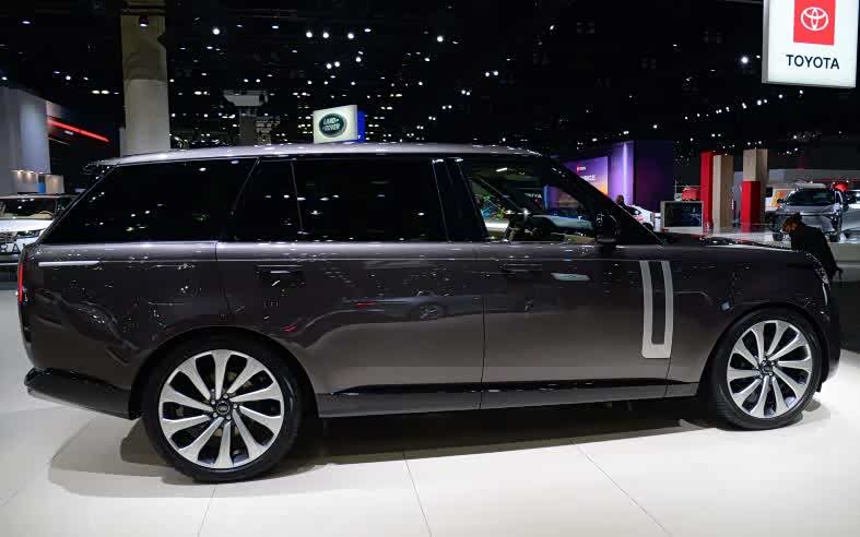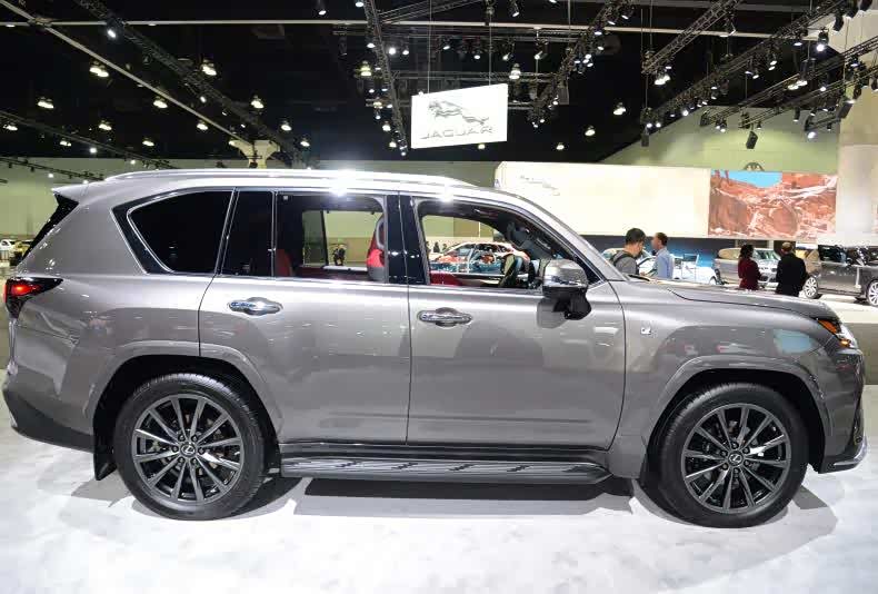 实拍的揽胜采用23英的多辐轮圈,轮胎规格285/40R23。实拍的LX用22英寸黑化轮,是LX车系首次使用的尺寸。揽胜侧窗所有接缝处都被抹平了,达到了近乎全平的效果这对降低风阻大有益处。LX还是选择将硬派风格进行到底,上有行李架、下有脚踏板,实用为主。