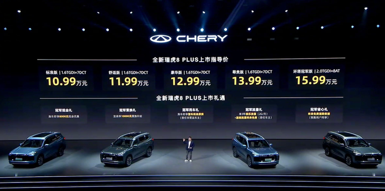 奇瑞瑞虎8PLUS上市了,共8款车型:燃油版有5个版本,售价为10.99~15.99万元;C-DM插电混动有3个版本,售价12.99~15.99万元。