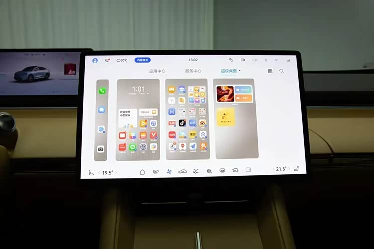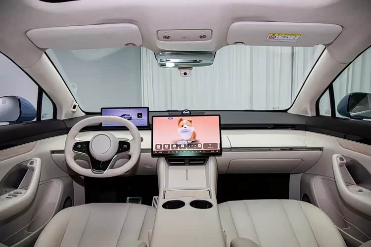 车内的话,智界R7延续了标志性的游艇式环抱座舱,配有两块悬浮式屏幕,其中主驾驶的12.3英寸远端领航屏位置比较靠前,通过这样的设计来省去HUD抬头显示,并且不用担心反光。