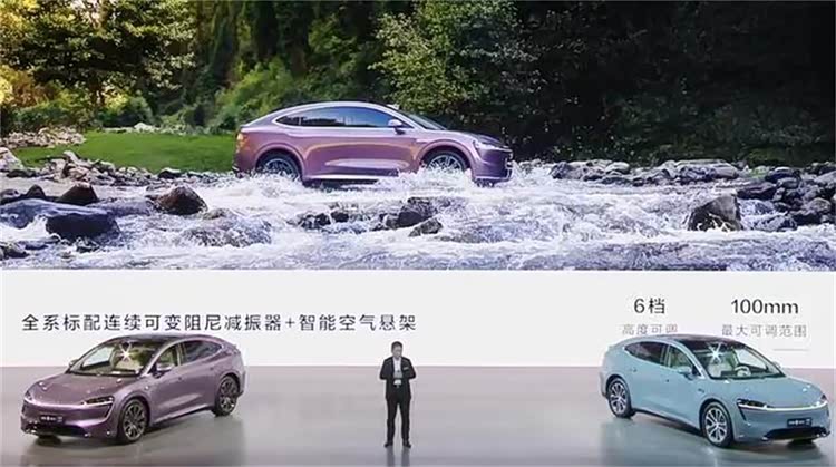 此外,智界R7还采用了华为途灵智能平台,配备前虚拟球销双叉臂+后五连杆悬架,全系标配连续可变阻尼减振器和空气悬架,可智能预瞄识别路况,空气悬架支持6挡高度调节,最大可调范围100mm。