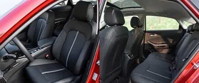 车内座椅表面为仿皮材质,造型设计得中规中矩,内部填充饱满厚实,前排仅主驾驶位支持多向电动调节 ,包含4向高低和2向腰部支撑,副驾驶位仍为手动方式,且无法控制位置高低,好在主副驾驶位均配备了加热功能。后排座椅延续前排设计风格,腿部空间表现不错,地板中间的凸起部分,对舒适性会有一些影响。后排提供了带杯架的中央扶手和空调出风口,但劲享版缺少后排USB电源接口;全系四款车型均搭载的是一块常规面积电动天窗,后备厢常规容积475L,后排座椅靠背支持按比例放倒,进一步提升车内实用空间,全系还标配了尾门感应开启功能。