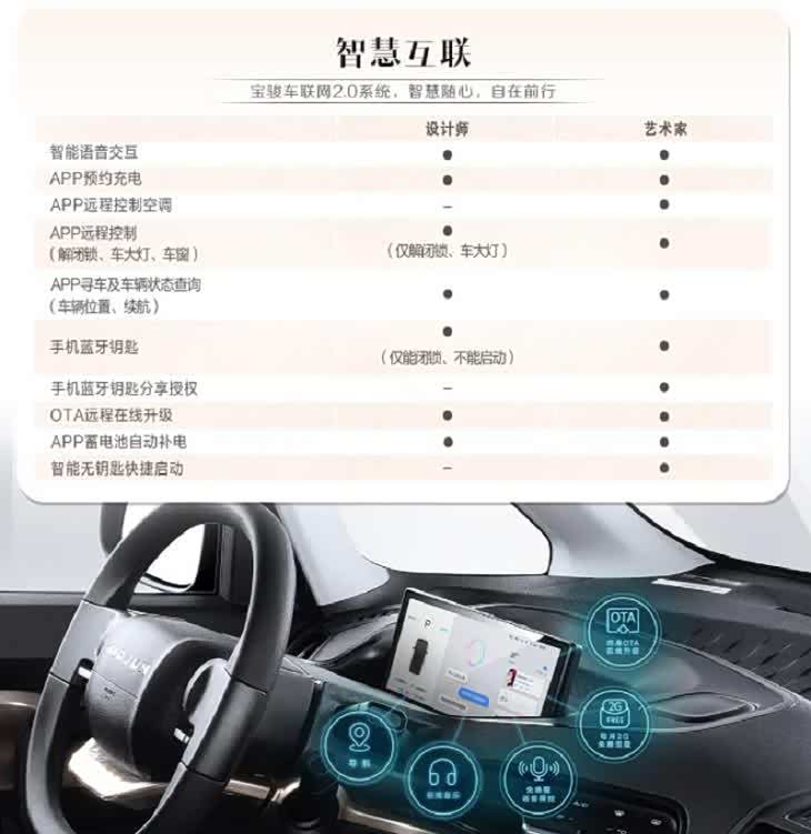 智能化配置部分,新车全系标配宝骏车联网2.0系统,内置智能语音交互、在线酷我音乐及百度地图等功能,且在电话通讯,娱乐等使用场景更支持免唤醒语音操控。通过手机新宝骏App,还可实现远程解锁、远程空调控制、预约充电、车辆状态查询、手机蓝牙钥匙等功能。此外,新车全系标配OTA 远程升级技术。