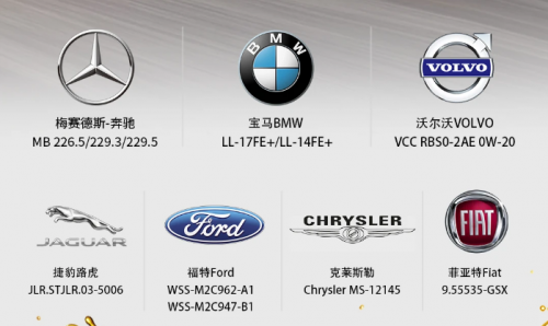 当然,作为霍尼韦尔的旗舰级油品,H MAX系列机油,当然也满足各大主流汽车品牌的机油规范,比如奔驰、宝马、福特、克莱斯勒,甚至连小众而高端的菲亚特、沃尔沃、捷豹、路虎全涵盖了。