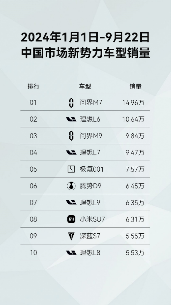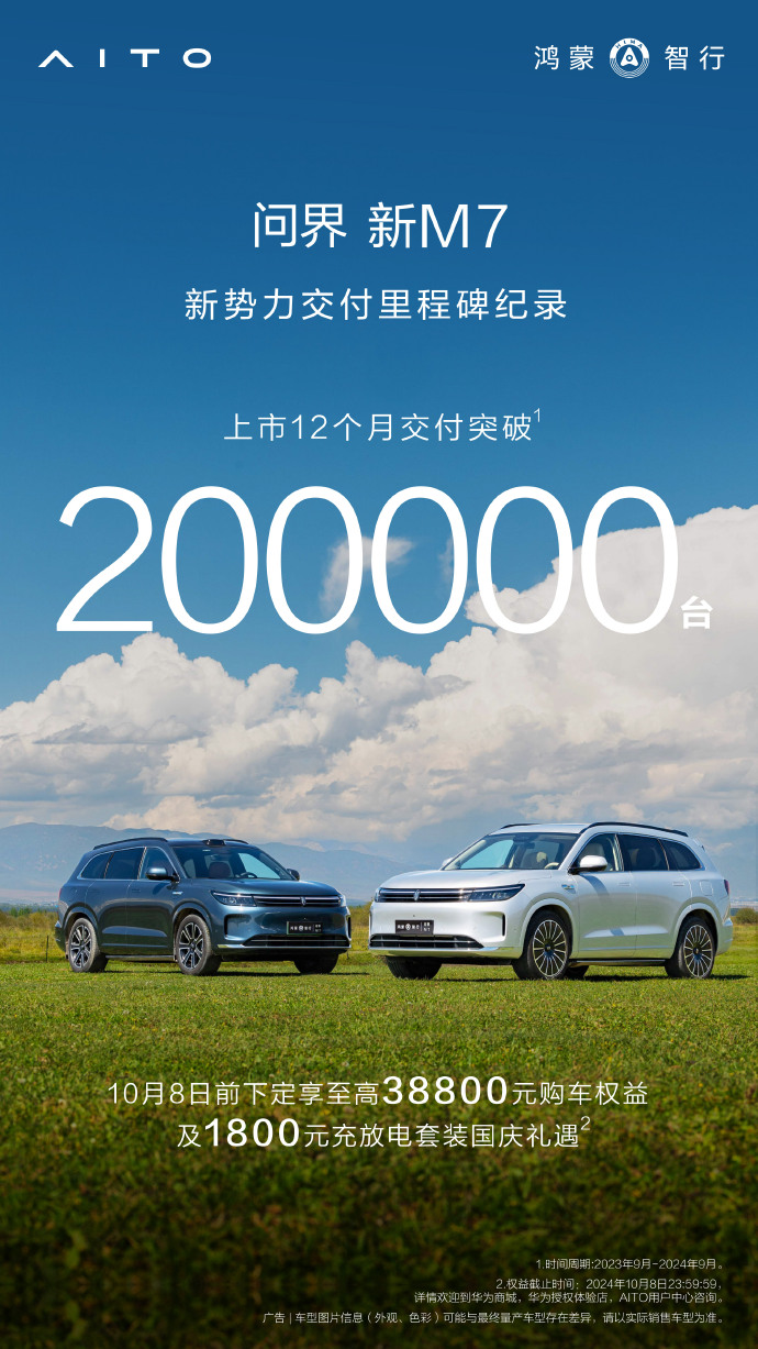 2024年,国内新能源汽车市场竞争愈发激烈。其中问界新M7销量表现亮眼,上市12个月累计交付量突破20万台,创造了国内新势力车型交付里程碑记录,展现出强大的市场竞争力。